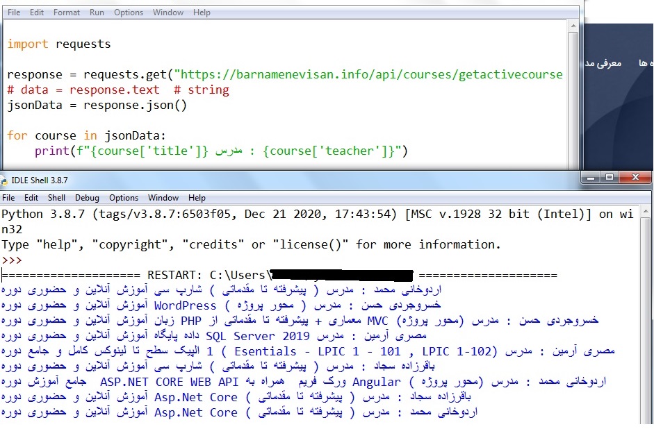 حالا اگر کسی در شرایطی بود که pyCharm نداشت و خواست تست بگیره، من امتحان کردم در محیط IDLE Shell خود پایتون، خروجی متن راست چین را بدون مشکل نمایش داد؛ کافیه فایل py را open کنیم و در پنجره باز شده F5 یا Run Module را بزنیم. مثلاً همین فایل درس 84 استاد اردوخانی: