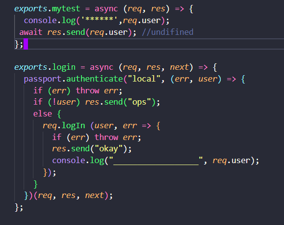 و در آخر قسمت کنترلر که استاد req.user تو قسمت login صحیح عمل میکنه اما تو جاهای دیگه نه