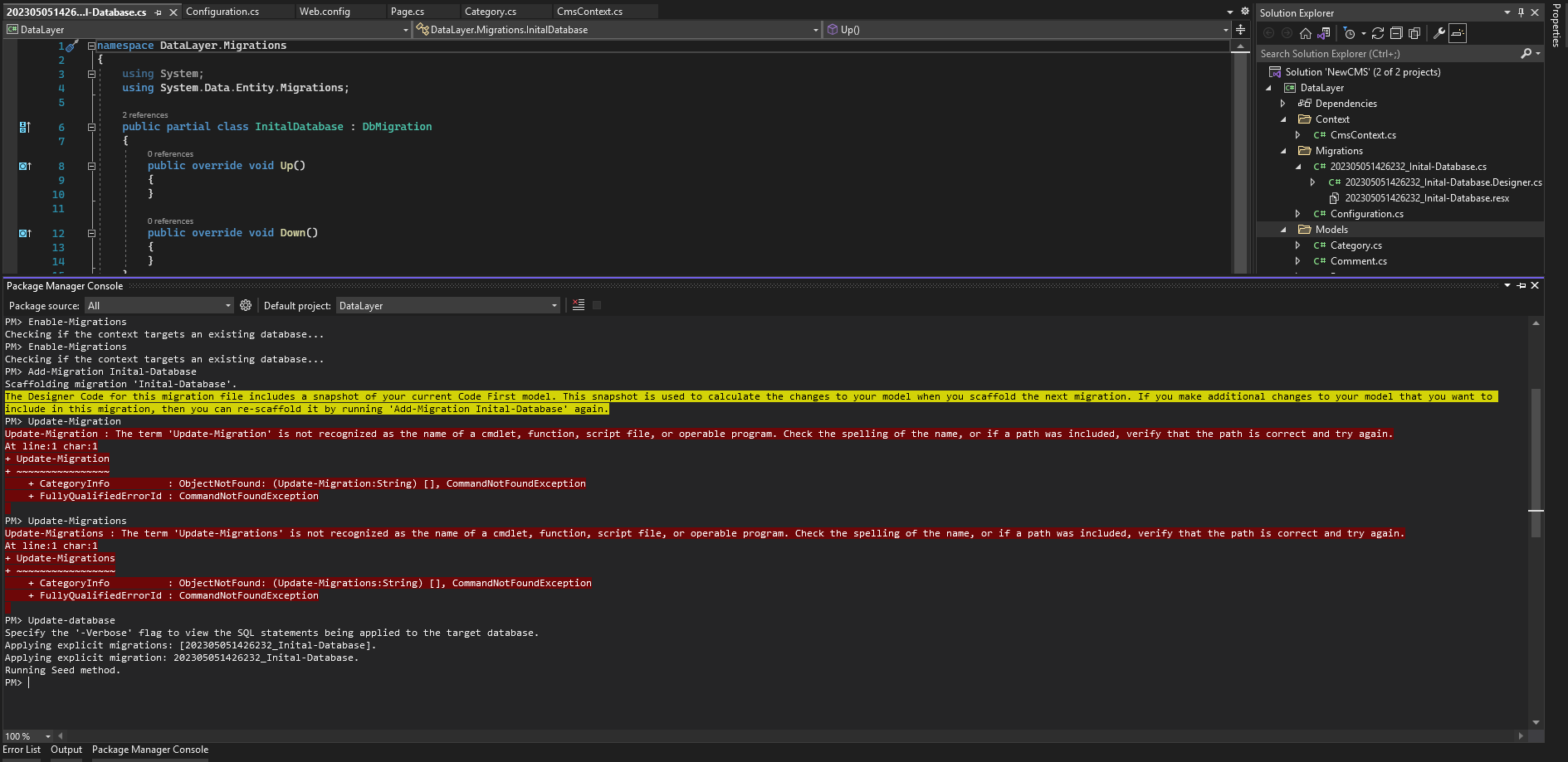 <add name="CmsContext" connectionString="Data Source=DESKTOP-6EBS4F5;Initial Catalog=CmsDB;Integrated Security=True" providerName="System.Data.SqlClient" />نکته بعدی که هست ولی add-migration رو میزنم یک مایگریشن جدید میسازه ولی متدهای up, down خالی هستن! فکر میکنم مشکل اینجا باشه ولی چرا همچین اتفاقی میفته؟