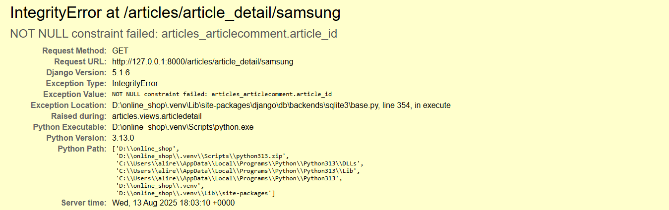 ببینین نمیدونم چه query روی دیتابیس میزنین اما خطایی که دریافت میکنین اینه که برای article_id مقداری رو پاس ندادین و به همین دلیل خطای not null رو دریافت میکنین