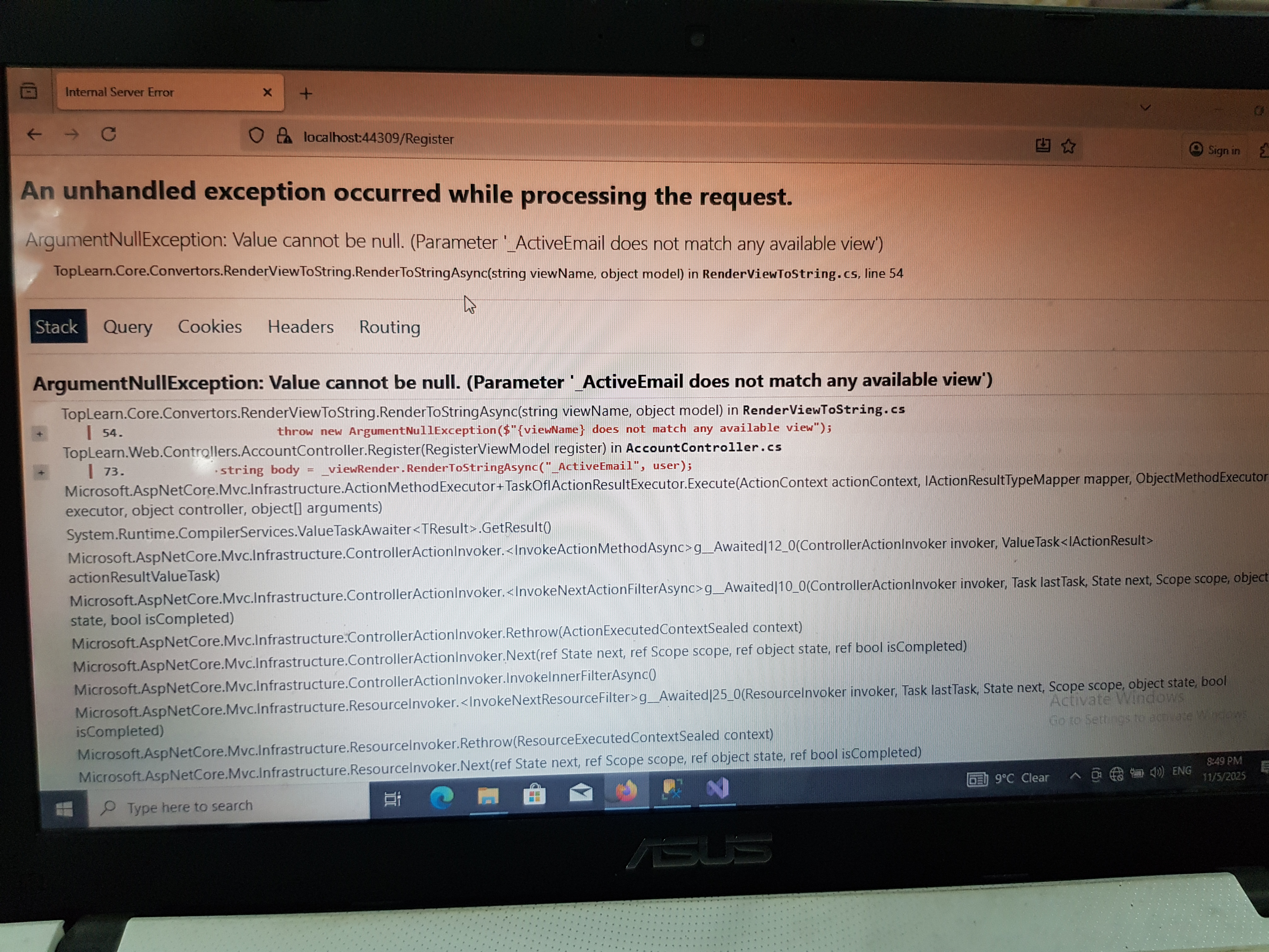 در هنگام عضویت در سایت پس از ذخیره کاربر در پایگاه داده پیغام زیر برای ارسال ایمیل فعال سازی از کلاس RenderViewToString نمایش داده می شود