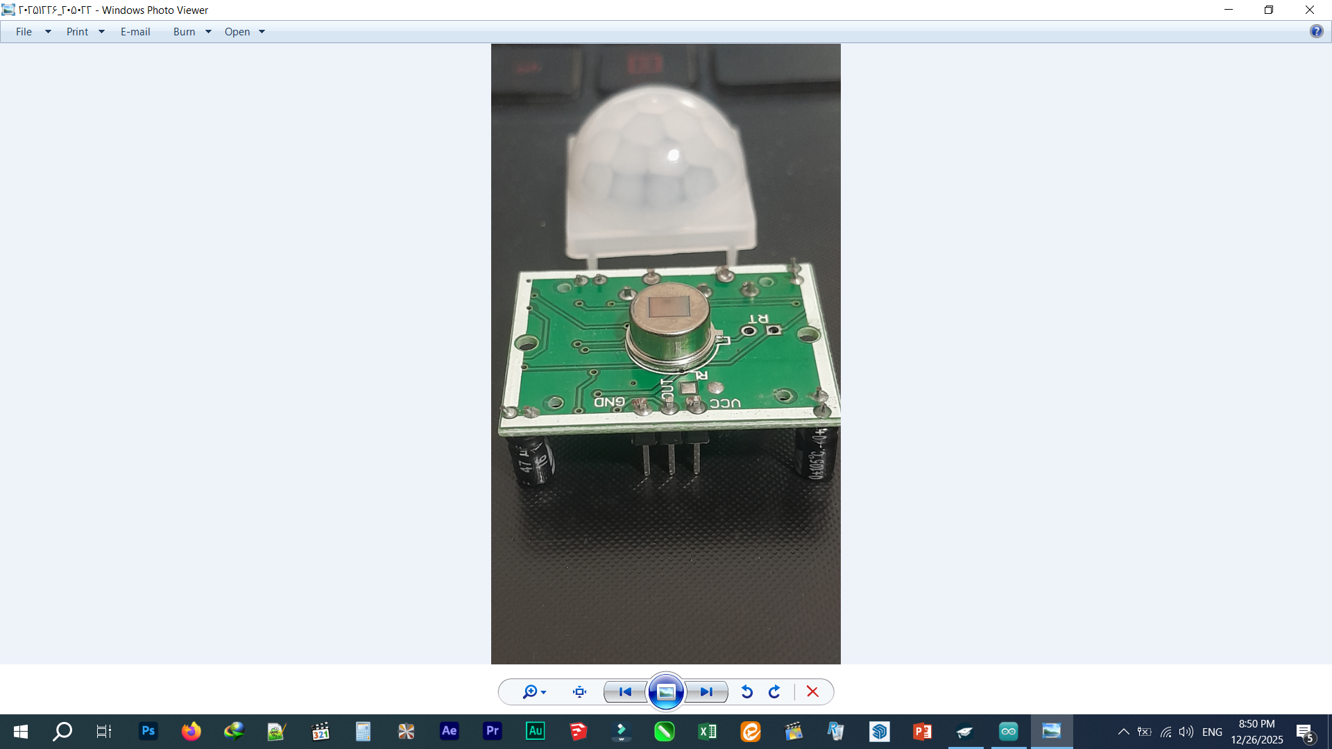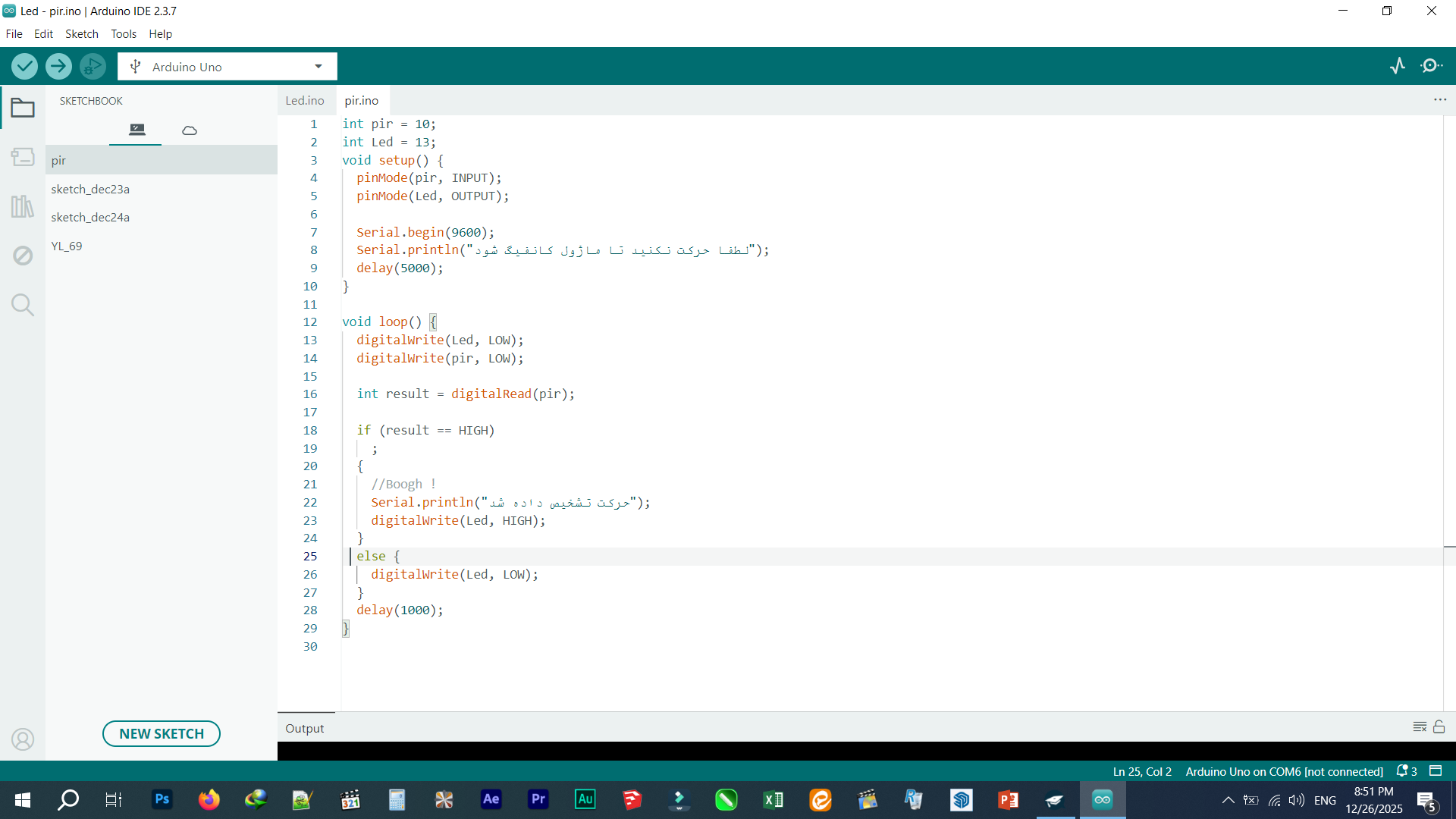 من این سنسر حرکت رو به اردینو وصل کردم و پایه(GND روبه GND برد متصل کردم و پایهOUT رو به پایه 10 وصل کردم و UCC روبه 5 ولت متصل کردم )و این برنامه رو براش نوشتم