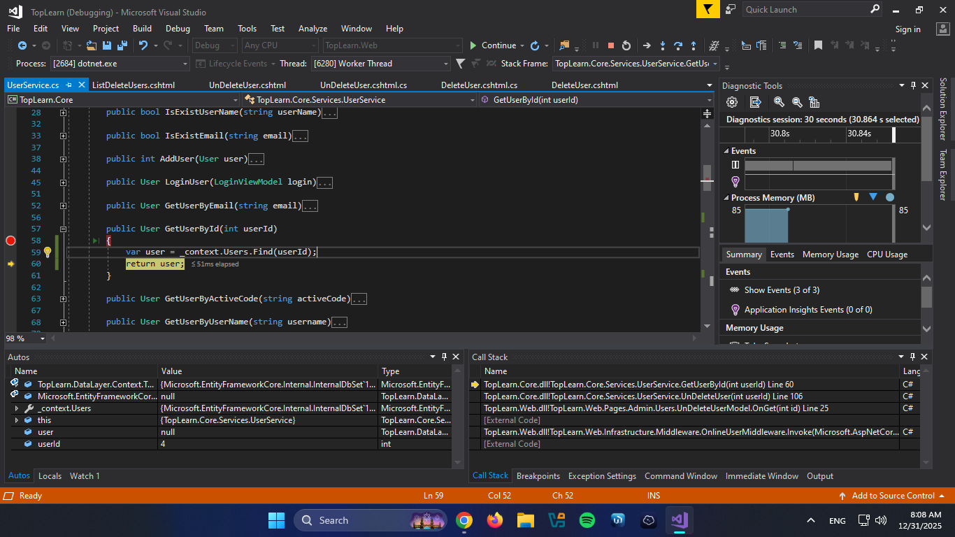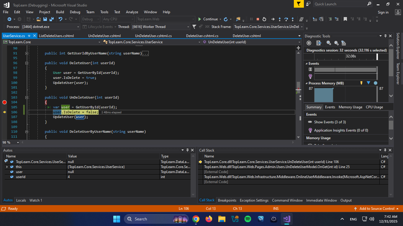 سلام وقت بخیر برای فعال سازی مجدد کاربر حذف شده ویو نوشتم و براش متد تعریف کردم و متد رو دقیقا مثل Delete User نوشتم اما وقتی یوزر ایدی پر میشه داخ ورودی متد یوزر رو پیدا نمیکنه و null برمیگردونه