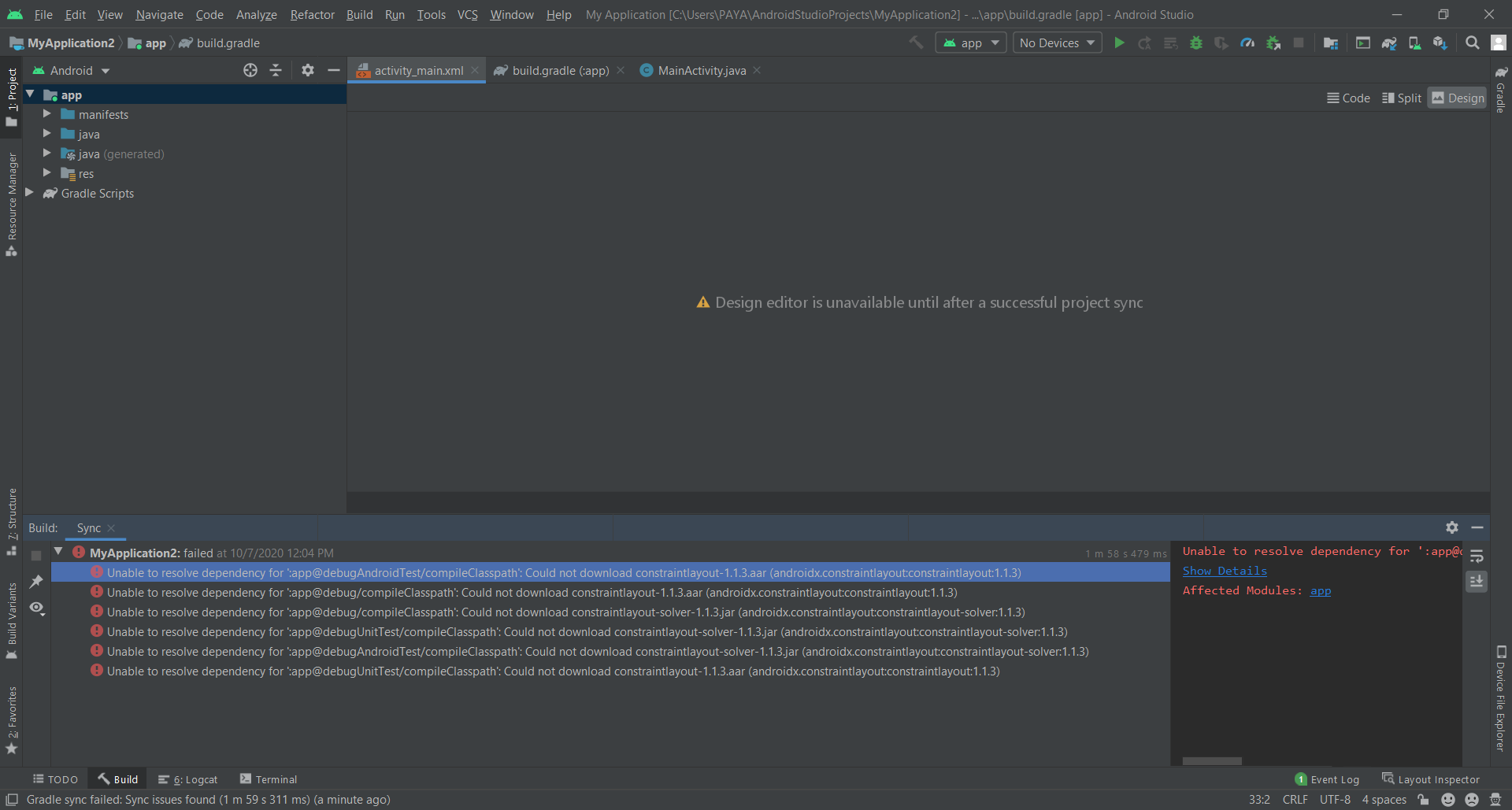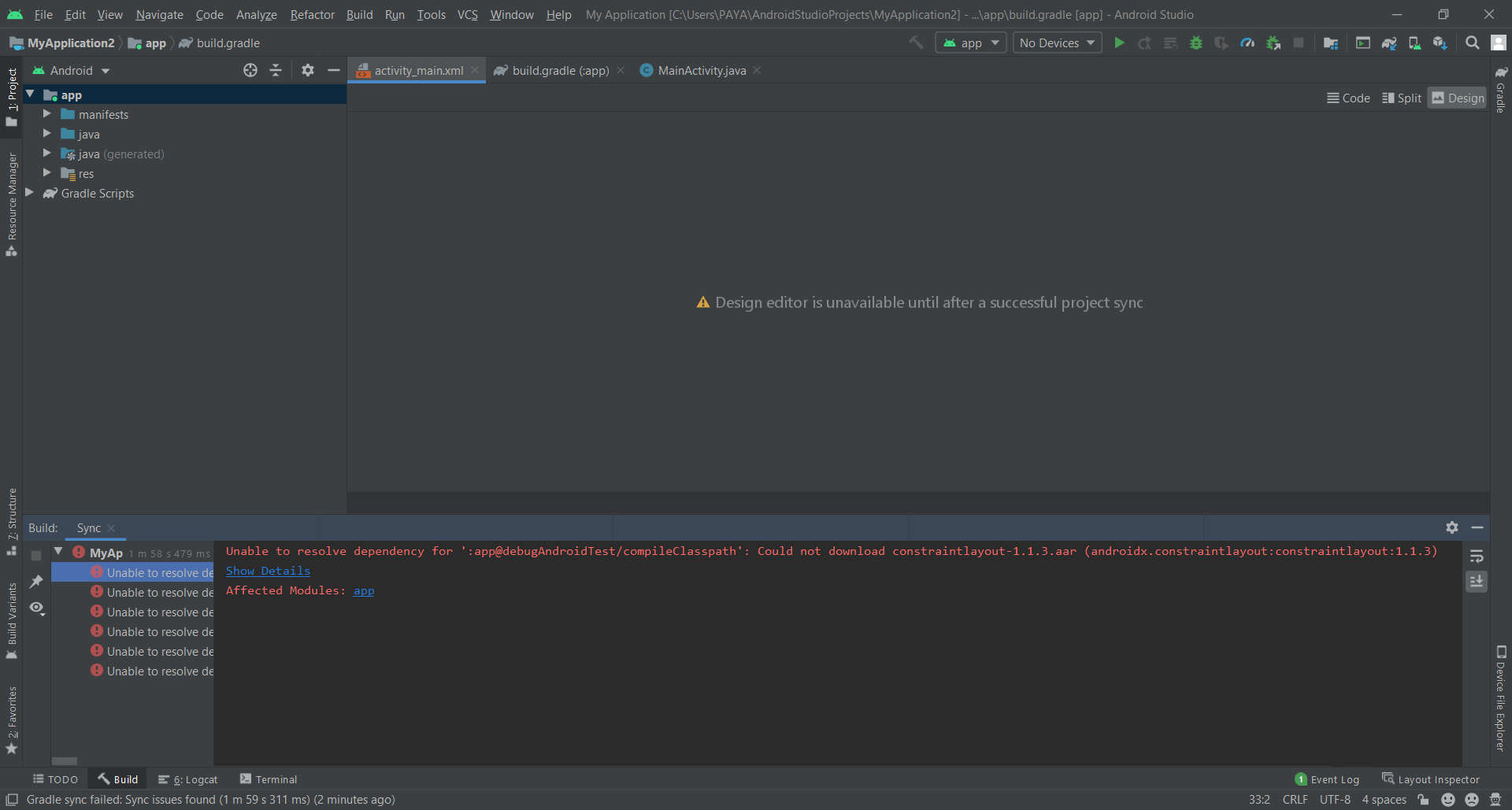 Unable to resolve dependency for ':app@debugAndroidTest/compileClasspath': Could not download constraintlayout-1.1.3.aar (androidx.constraintlayout:constraintlayout:1.1.3)