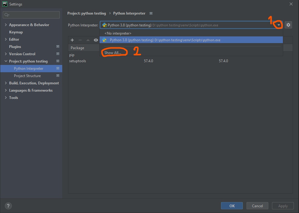 برای اینکار کافیه که به بخش تنظیمات اینترپرتر پایچارم بروید. سپس مثل تصویر زیر اول روی مثلث جلوی بخش python interpreter کلیک کنید و بعد Show all رو بزنید