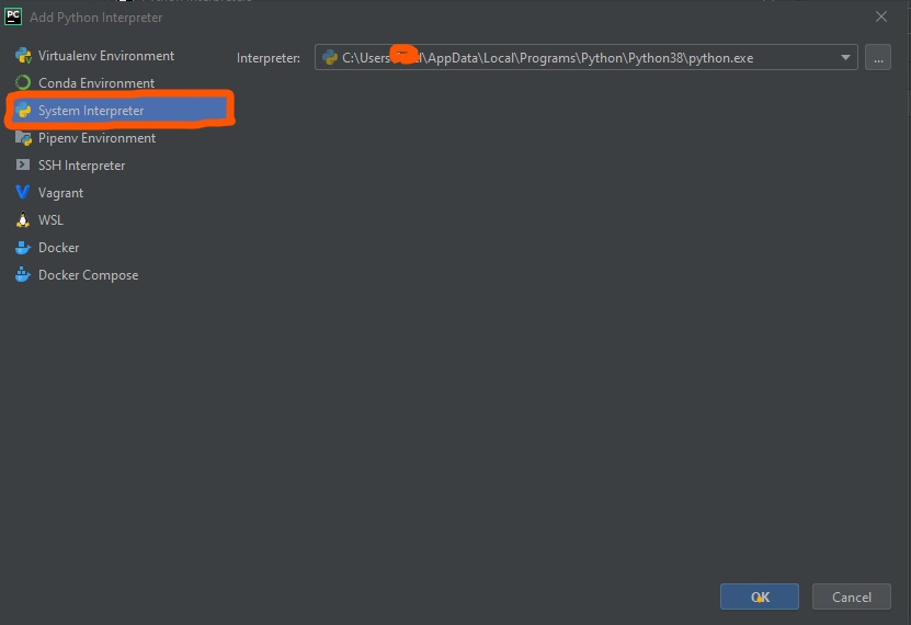 حالا از داخل کادر روبروی interpreter، نسخه پایتون نصب شده روی سیستم تون رو انتخاب کنید و در آخر هم OK رو بزنید