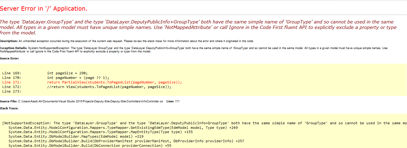 Exception Details: System.NotSupportedException: The type 'DataLayer.GroupType' and the type 'DataLayer.DeputyPublicInfo+GroupType' both have the same simple name of 'GroupType' and so cannot be used in the same model. All types in a given model must have unique simple names. Use 'NotMappedAttribute' or call Ignore in the Code First fluent API to explicitly exclude a property or type from the model.