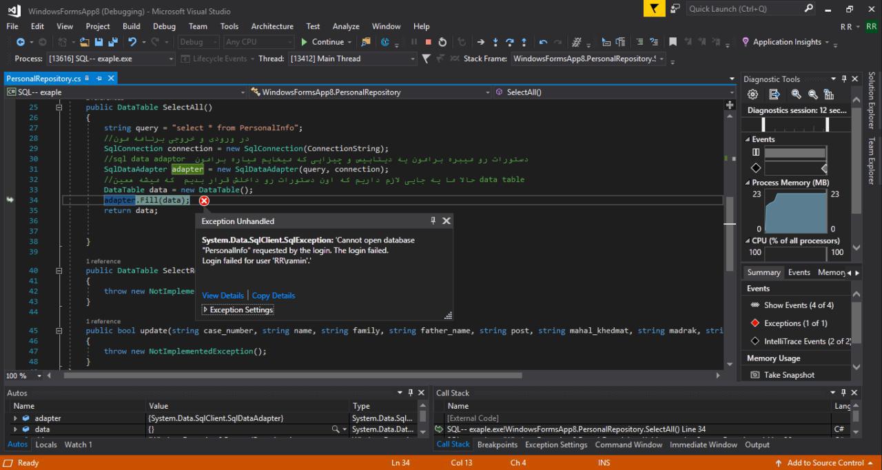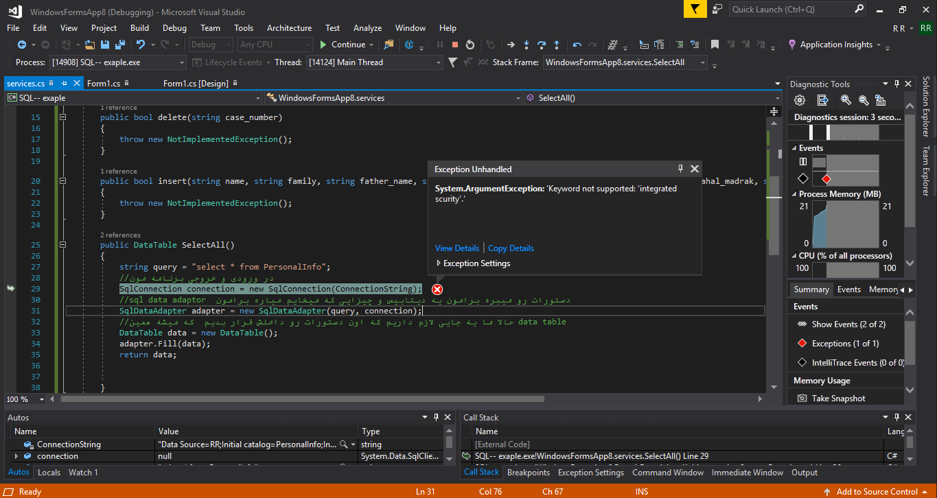 استاد مشکل قبلیم حل شد غلط نوشته بودم کلمات رو :| درستش کردم حالا ارور میده میگه نمیتونه به دیتابیس وصل شه. هم نقطه رو برای Data Source تست کردم هم همون اسم سیستمی که ازش استفاده می کنم
