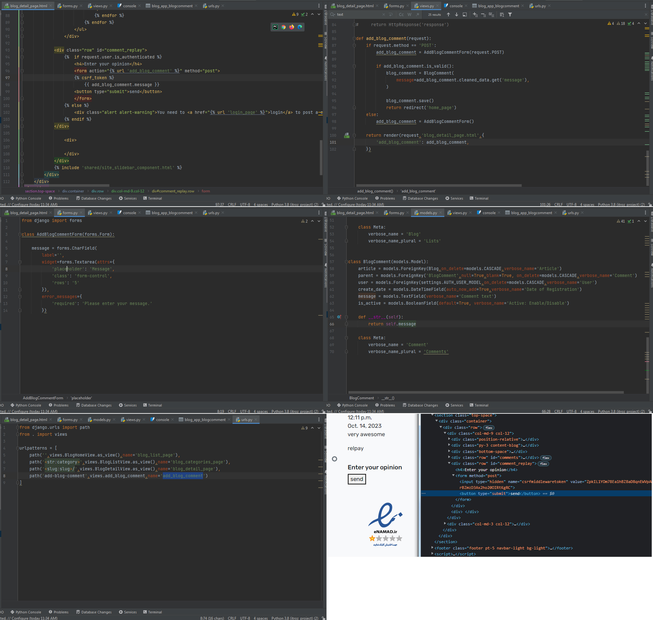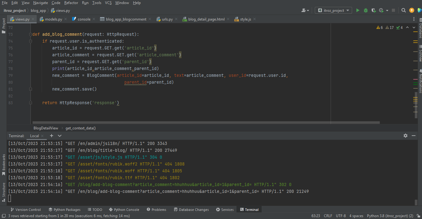 در قسمت نظرات کدهای جاوا اسکریپت رو نوشتم و همانطور که در لاگ نرم افزار مشاهده می کنید وقتی کامنتی نوشته میشه به درستی به بک اند منتقل میشه. مشکل اینجاس که اطلاعات در دیتابیس ذخیره نمیشه. ویو رو چندین بار چک کردم متوجه نشدم مشکل از کجاست