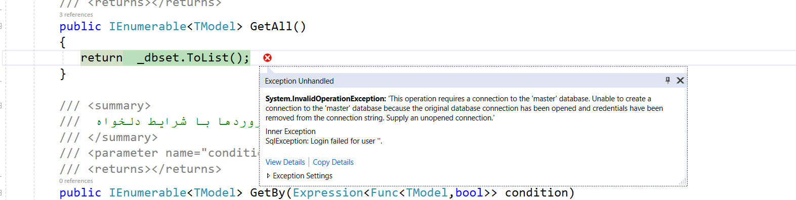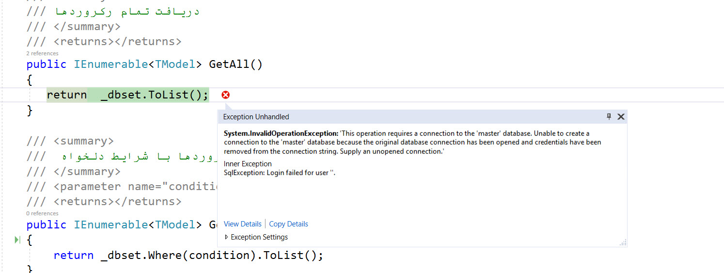 System.InvalidOperationException: 'This operation requires a connection to the 'master' database. Unable to create a connection to the 'master' database because the original database connection has been opened and credentials have been removed from the connection string. Supply an unopened connection.'