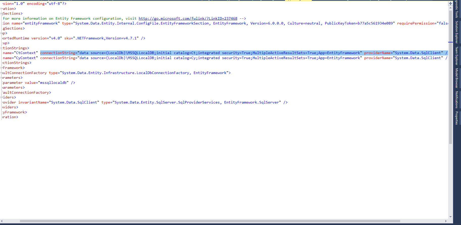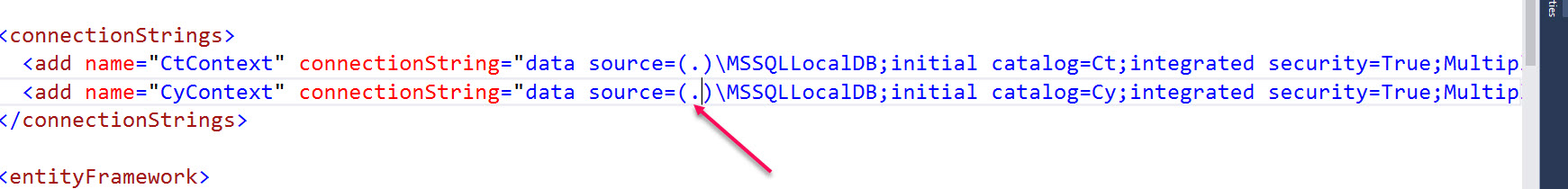 <add name="CtContext" connectionString="data source=(.)\MSSQLLocalDB;initial catalog=Ct;integrated security=True;MultipleActiveResultSets=True;App=EntityFramework" providerName="System.Data.SqlClient" />
