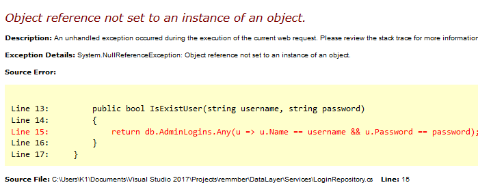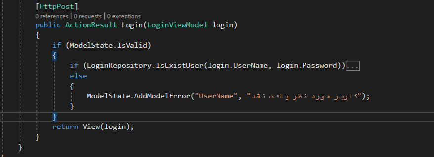 حالا دستوری که در IsExistUser نوشته بودم را درون دستور try قرار دادم دیه این پیغام ارور را نمایش نمیدهد اما هر چی نام کاربری و رمز عبور میزنم مینویسد که نام کاربری یافت نشد